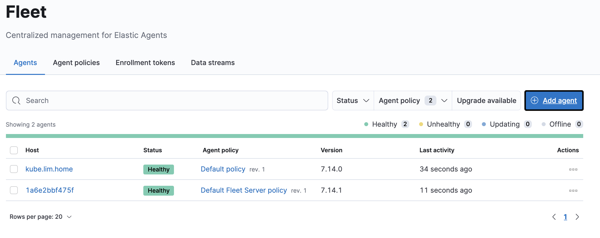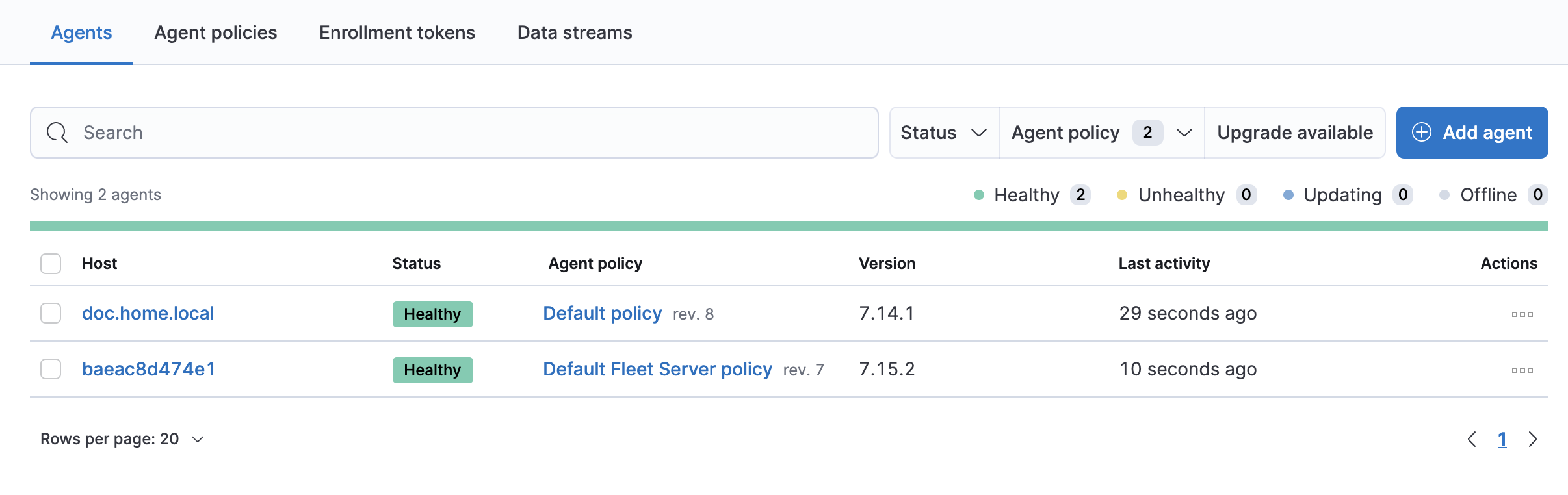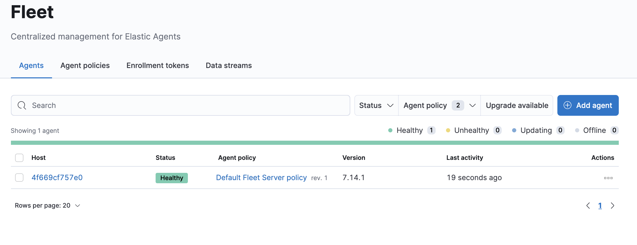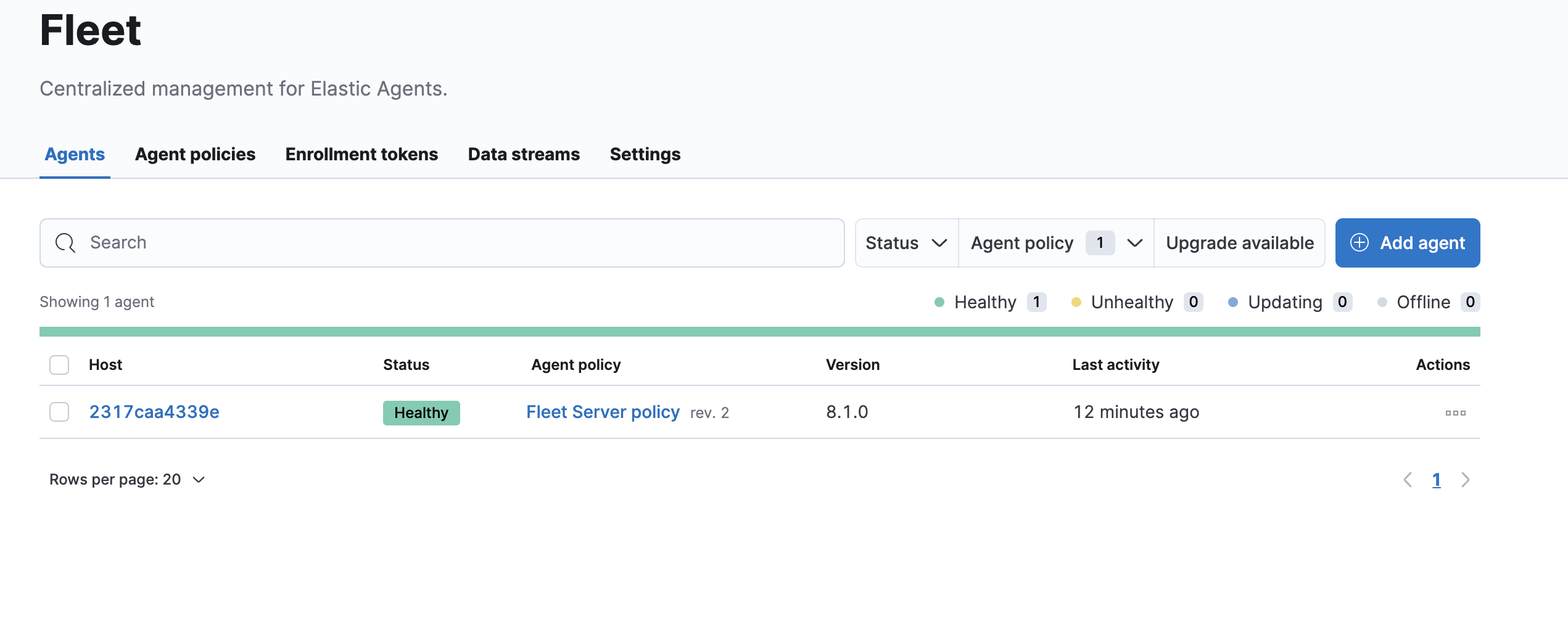 Now I go back to my Fleet -> Agents page and now I can see that the agent is reporting in