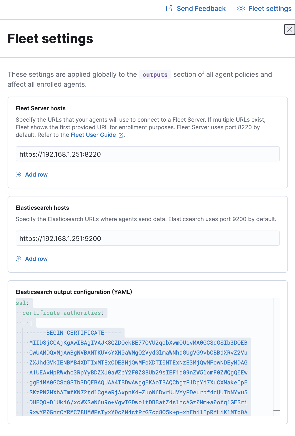 Now we need to add our certificate_authorities. You can copy out your ca.crt onto each of the elastic-agents endpoints but I found it easier to just put the contents of the ca.crt into this field.