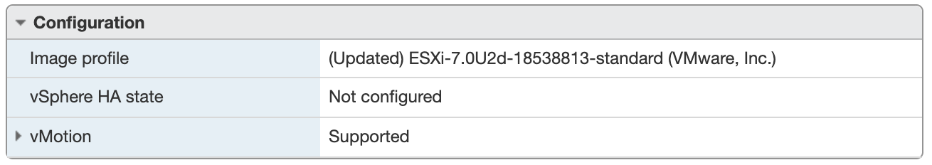 --no-hardware-warningfor it to complete. If you have newer hardware you will not need to add this option.[root@localhost:~] esxcli software profile update -p ESXi-7.0U2d-18538813-standard -d https://hostupdate.vmware.com/software/VUM/PRODUCTION/main/vmw-depot-index.xml --no-hardware-warning ing Update Result Message: The update completed successfully, but the system needs to be rebooted for the changes to be effective. Reboot Required: true VIBs Installed: VMW_bootbank_bnxtnet_216.0.50.0-34vmw.702.0.20.18426014, VMW_bootbank_bnxtroce_216.0.58.0-20vmw.702.0.20.18426014, VMW_bootbank_i40enu_1.8.1.137-1vmw.702.0.20.18426014, VMW_bootbank_lpfc_12.8.298.3-2vmw.702.0.20.18426014, VMW_bootbank_qedentv_3.40.5.53-20vmw.702.0.20.18426014, VMW_bootbank_qedrntv_3.40.5.53-17vmw.702.0.20.18426014, VMW_bootbank_vmkusb_0.1-4vmw.702.0.20.18426014, VMware_bootbank_clusterstore_7.0.2-0.25.18538813, VMware_bootbank_cpu-microcode_7.0.2-0.25.18538813, VMware_bootbank_crx_7.0.2-0.25.18538813, VMware_bootbank_esx-base_7.0.2-0.25.18538813, VMware_bootbank_esx-dvfilter-generic-fastpath_7.0.2-0.25.18538813, VMware_bootbank_esx-update_7.0.2-0.25.18538813, VMware_bootbank_esx-xserver_7.0.2-0.25.18538813, VMware_bootbank_gc_7.0.2-0.25.18538813, VMware_bootbank_loadesx_7.0.2-0.25.18538813, VMware_bootbank_native-misc-drivers_7.0.2-0.25.18538813, VMware_bootbank_vdfs_7.0.2-0.25.18538813, VMware_bootbank_vsan_7.0.2-0.25.18538813, VMware_bootbank_vsanhealth_7.0.2-0.25.18538813, VMware_locker_tools-light_11.2.6.17901274-18295176 VIBs Removed: VMW_bootbank_bnxtnet_216.0.50.0-34vmw.702.0.0.17867351, VMW_bootbank_bnxtroce_216.0.58.0-19vmw.702.0.0.17867351, VMW_bootbank_i40enu_1.8.1.136-1vmw.702.0.0.17867351, VMW_bootbank_lpfc_12.8.298.3-1vmw.702.0.0.17867351, VMW_bootbank_qedentv_3.40.5.53-20vmw.702.0.0.17867351, VMW_bootbank_qedrntv_3.40.5.53-16vmw.702.0.0.17867351, VMW_bootbank_vmkusb_0.1-1vmw.702.0.0.17867351, VMware_bootbank_clusterstore_7.0.2-0.0.17867351, VMware_bootbank_cpu-microcode_7.0.2-0.0.17867351, VMware_bootbank_crx_7.0.2-0.0.17867351, VMware_bootbank_esx-base_7.0.2-0.0.17867351, VMware_bootbank_esx-dvfilter-generic-fastpath_7.0.2-0.0.17867351, VMware_bootbank_esx-update_7.0.2-0.0.17867351, VMware_bootbank_esx-xserver_7.0.2-0.0.17867351, VMware_bootbank_gc_7.0.2-0.0.17867351, VMware_bootbank_loadesx_7.0.2-0.0.17867351, VMware_bootbank_native-misc-drivers_7.0.2-0.0.17867351, VMware_bootbank_vdfs_7.0.2-0.0.17867351, VMware_bootbank_vsan_7.0.2-0.0.17867351, VMware_bootbank_vsanhealth_7.0.2-0.0.17867351, VMware_locker_tools-light_11.2.5.17337674-17867351 VIBs Skipped: VMW_bootbank_atlantic_1.0.3.0-8vmw.702.0.0.17867351, VMW_bootbank_brcmfcoe_12.0.1500.1-2vmw.702.0.0.17867351, VMW_bootbank_brcmnvmefc_12.8.298.1-1vmw.702.0.0.17867351, VMW_bootbank_elxiscsi_12.0.1200.0-8vmw.702.0.0.17867351, VMW_bootbank_elxnet_12.0.1250.0-5vmw.702.0.0.17867351, VMW_bootbank_iavmd_2.0.0.1152-1vmw.702.0.0.17867351, VMW_bootbank_icen_1.0.0.10-1vmw.702.0.0.17867351, VMW_bootbank_igbn_1.4.11.2-1vmw.702.0.0.17867351, VMW_bootbank_irdman_1.3.1.19-1vmw.702.0.0.17867351, VMW_bootbank_iser_1.1.0.1-1vmw.702.0.0.17867351, VMW_bootbank_ixgben_1.7.1.35-1vmw.702.0.0.17867351, VMW_bootbank_lpnic_11.4.62.0-1vmw.702.0.0.17867351, VMW_bootbank_lsi-mr3_7.716.03.00-1vmw.702.0.0.17867351, VMW_bootbank_lsi-msgpt2_20.00.06.00-3vmw.702.0.0.17867351, VMW_bootbank_lsi-msgpt35_17.00.02.00-1vmw.702.0.0.17867351, VMW_bootbank_lsi-msgpt3_17.00.10.00-2vmw.702.0.0.17867351, VMW_bootbank_mtip32xx-native_3.9.8-1vmw.702.0.0.17867351, VMW_bootbank_ne1000_0.8.4-11vmw.702.0.0.17867351, VMW_bootbank_nenic_1.0.33.0-1vmw.702.0.0.17867351, VMW_bootbank_nfnic_4.0.0.63-1vmw.702.0.0.17867351, VMW_bootbank_nhpsa_70.0051.0.100-2vmw.702.0.0.17867351, VMW_bootbank_nmlx4-core_3.19.16.8-2vmw.702.0.0.17867351, VMW_bootbank_nmlx4-en_3.19.16.8-2vmw.702.0.0.17867351, VMW_bootbank_nmlx4-rdma_3.19.16.8-2vmw.702.0.0.17867351, VMW_bootbank_nmlx5-core_4.19.16.10-1vmw.702.0.0.17867351, VMW_bootbank_nmlx5-rdma_4.19.16.10-1vmw.702.0.0.17867351, VMW_bootbank_ntg3_4.1.5.0-0vmw.702.0.0.17867351, VMW_bootbank_nvme-pcie_1.2.3.11-1vmw.702.0.0.17867351, VMW_bootbank_nvmerdma_1.0.2.1-1vmw.702.0.0.17867351, VMW_bootbank_nvmxnet3-ens_2.0.0.22-1vmw.702.0.0.17867351, VMW_bootbank_nvmxnet3_2.0.0.30-1vmw.702.0.0.17867351, VMW_bootbank_pvscsi_0.1-2vmw.702.0.0.17867351, VMW_bootbank_qcnic_1.0.15.0-11vmw.702.0.0.17867351, VMW_bootbank_qfle3_1.0.67.0-14vmw.702.0.0.17867351, VMW_bootbank_qfle3f_1.0.51.0-19vmw.702.0.0.17867351, VMW_bootbank_qfle3i_1.0.15.0-12vmw.702.0.0.17867351, VMW_bootbank_qflge_1.1.0.11-1vmw.702.0.0.17867351, VMW_bootbank_rste_2.0.2.0088-7vmw.702.0.0.17867351, VMW_bootbank_sfvmk_2.4.0.2010-4vmw.702.0.0.17867351, VMW_bootbank_smartpqi_70.4000.0.100-6vmw.702.0.0.17867351, VMW_bootbank_vmkata_0.1-1vmw.702.0.0.17867351, VMW_bootbank_vmkfcoe_1.0.0.2-1vmw.702.0.0.17867351, VMW_bootbank_vmw-ahci_2.0.9-1vmw.702.0.0.17867351, VMware_bootbank_elx-esx-libelxima.so_12.0.1200.0-4vmw.702.0.0.17867351, VMware_bootbank_esx-ui_1.34.8-17417756, VMware_bootbank_lsuv2-hpv2-hpsa-plugin_1.0.0-3vmw.702.0.0.17867351, VMware_bootbank_lsuv2-intelv2-nvme-vmd-plugin_2.0.0-2vmw.702.0.0.17867351, VMware_bootbank_lsuv2-lsiv2-drivers-plugin_1.0.0-5vmw.702.0.0.17867351, VMware_bootbank_lsuv2-nvme-pcie-plugin_1.0.0-1vmw.702.0.0.17867351, VMware_bootbank_lsuv2-oem-dell-plugin_1.0.0-1vmw.702.0.0.17867351, VMware_bootbank_lsuv2-oem-hp-plugin_1.0.0-1vmw.702.0.0.17867351, VMware_bootbank_lsuv2-oem-lenovo-plugin_1.0.0-1vmw.702.0.0.17867351, VMware_bootbank_lsuv2-smartpqiv2-plugin_1.0.0-6vmw.702.0.0.17867351, VMware_bootbank_qlnativefc_4.1.14.0-5vmw.702.0.0.17867351, VMware_bootbank_vmware-esx-esxcli-nvme-plugin_1.2.0.42-1vmw.702.0.0.17867351