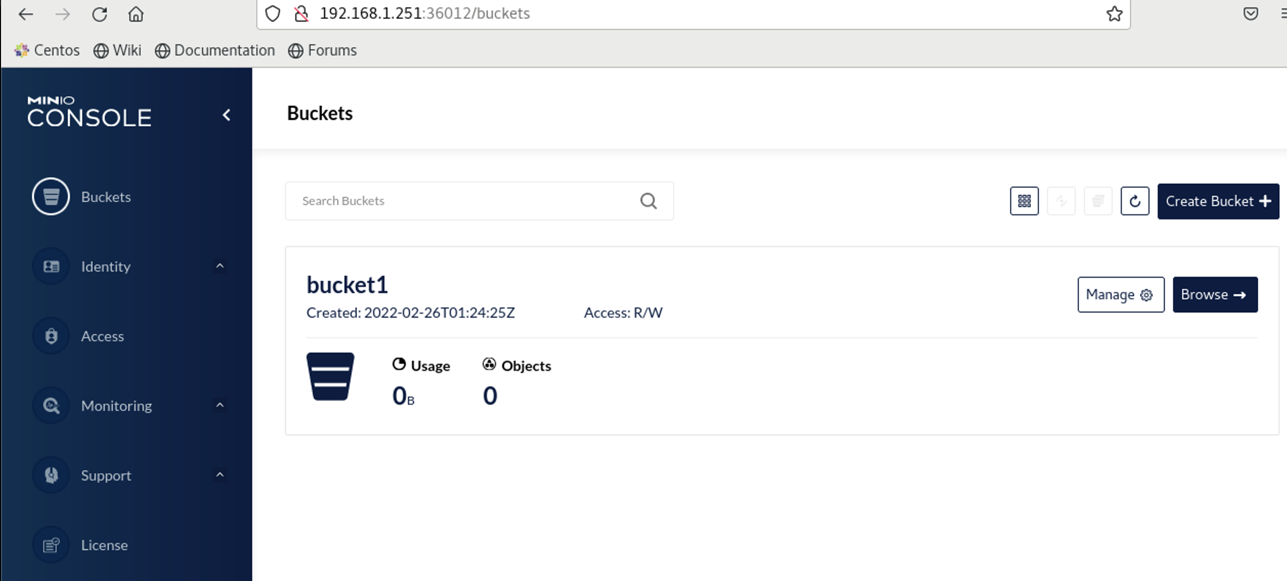 Instead of getting mc I am just going to browse to my minio GUI and create a bucket