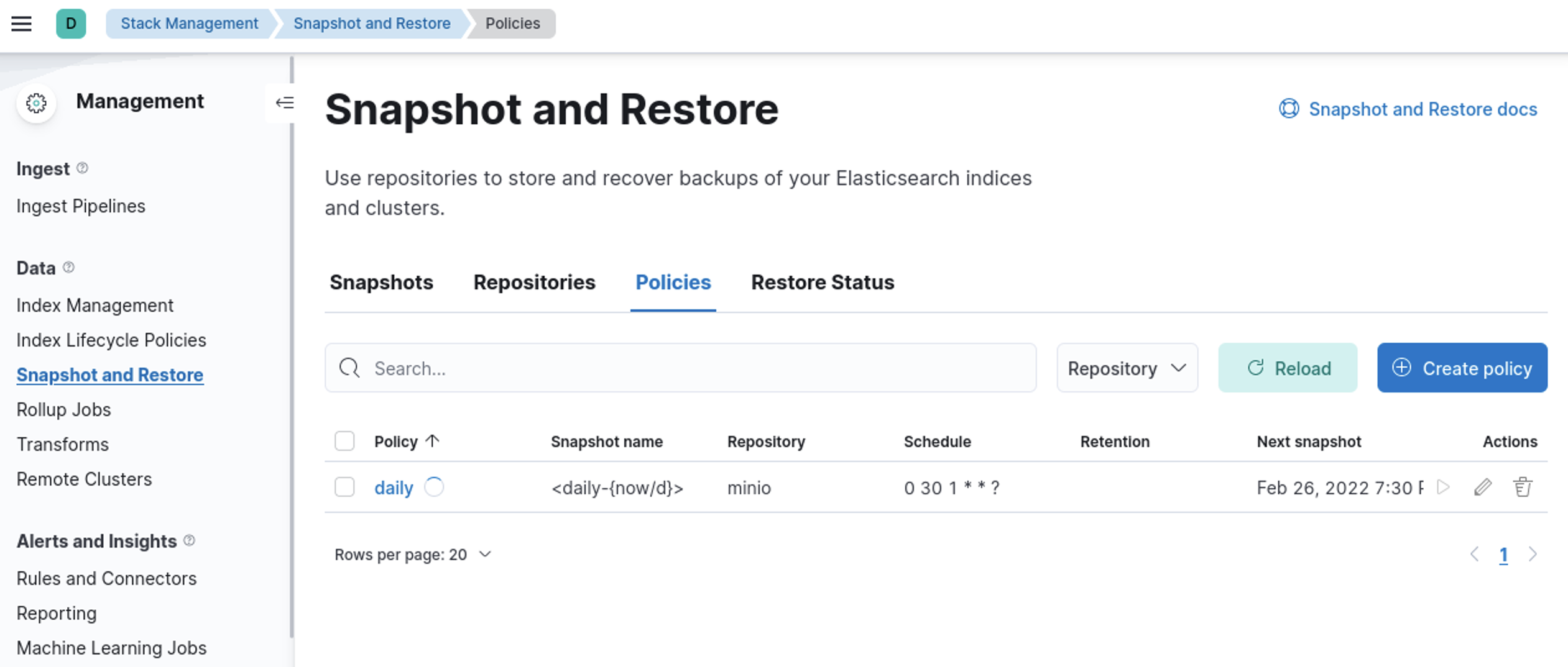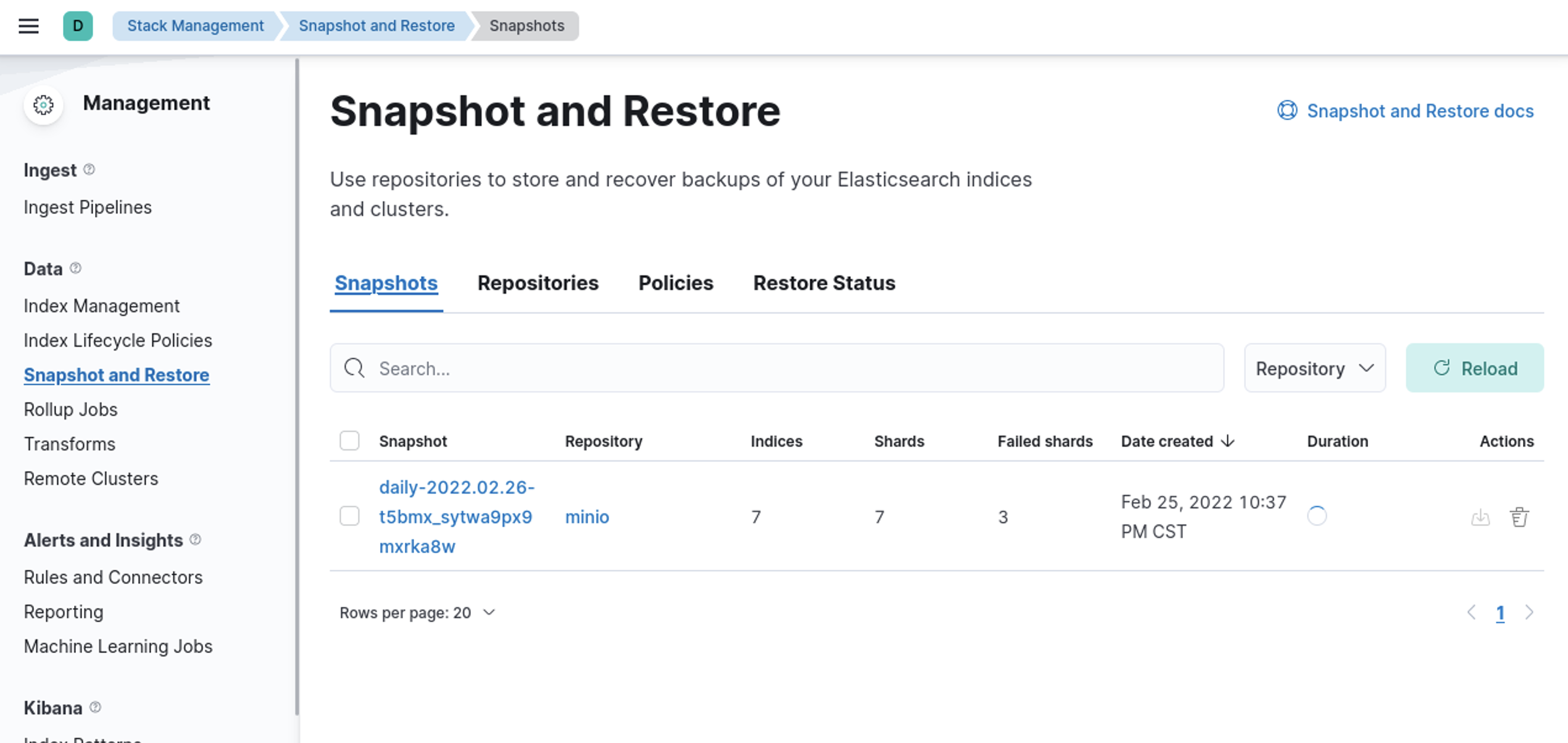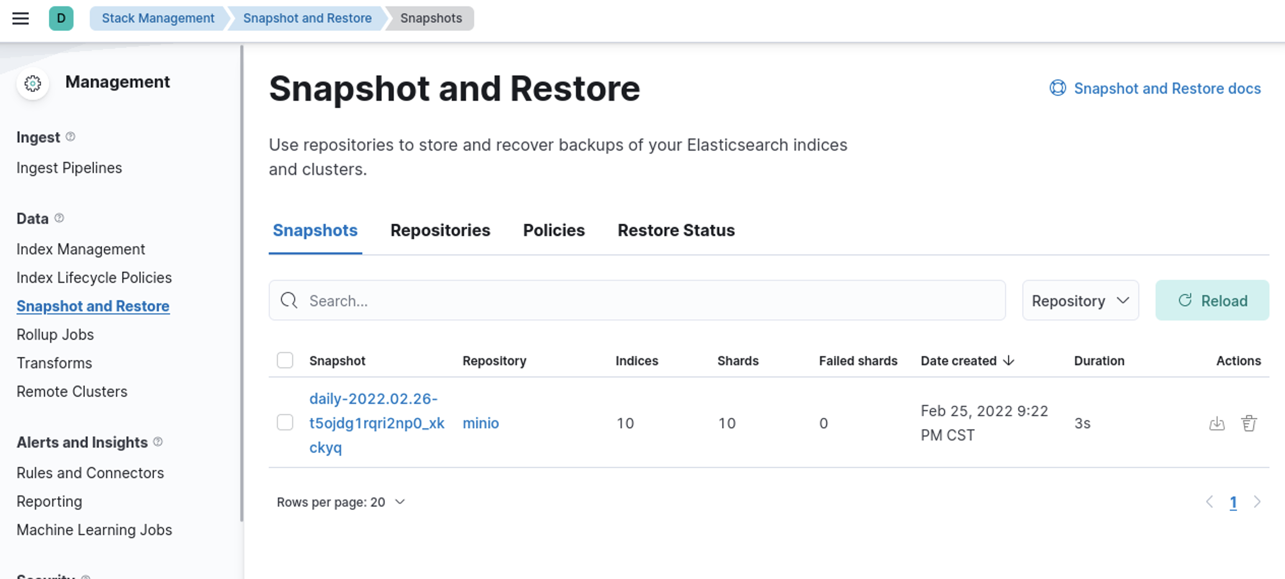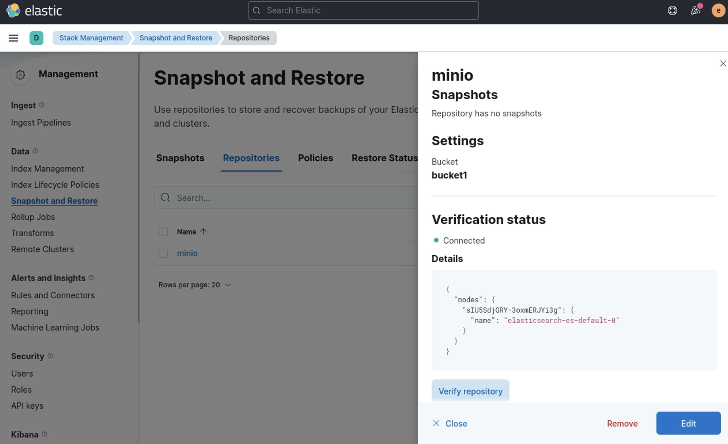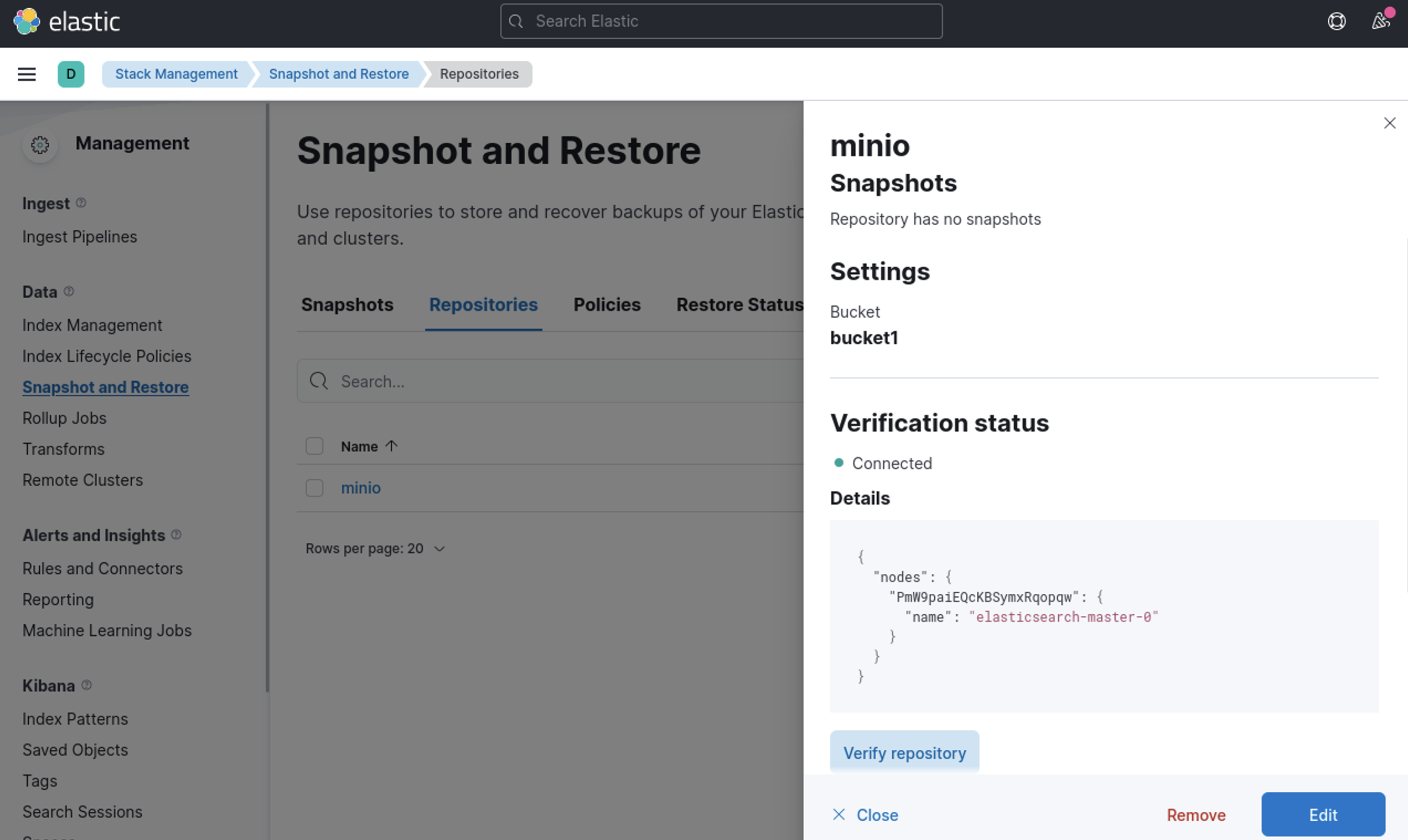 Now goto Stack Management -> Snapshot and Restore -> Repositories – > minio -> verify repository
